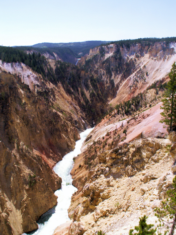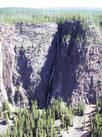 The Mighty 350 travels over Dunraven Pass and arrives once again at the north rim of the Grand Canyon of the Yellowstone. Wind greets us as we walk a short distance to view the Lower Falls from yet another viewpoint. Leaving JoEllen at the truck, David hikes along the north rim to view Silver Cord Cascade. This 800 foot waterfall is in a crevice partially hidden from view except from directly across the canyon. |