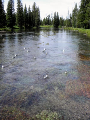 Big Springs is located where the 1.3 million year old Henry's Fork Caldera is covered by the western edge of the more recent Buffalo Lake lava flow, which erupted from vents on the Yellowstone Plateau to the east. Geologist believe that the main source of the springs is the rain and snow that falls on the Yellowstone Plateau. This water percolates through the highly fractured lava until it meets less permeable glacial and lake sediments beneath the lava. This causes the water to spread laterally, emerging at the base of the Plateau as Big Springs, the largest of many springs that emerge along the western edge of the Yellowstone Plateau. Thermal waters from deeeper sources may contribute to the springs' flow and account for its year round temperature of 52 degrees. Big Springs is the headwater for the Henry's Fork of the Snake River. It flows at 150 million gallons per day of pure, clean water. |