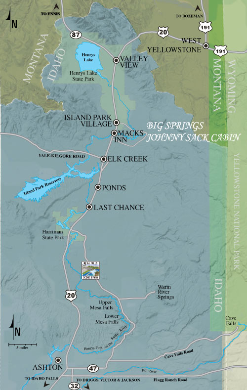 Johnny Sack was a craftsman and a German immigrant who finished building his cabin and water wheel from native lumber and rock in 1935. He was not a big man, and stood less than five feet tall, so he built the cabin and his furniture to to fit his height. Along side the cabin stands a unique, working water wheel to supply electricity and pump water to the cabin. Henry's Fork of the Snake River was named for Andrew Henry, who led a trapping expedition through the area in 1810. |