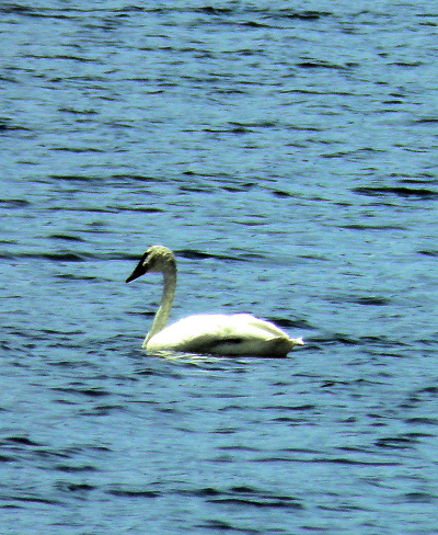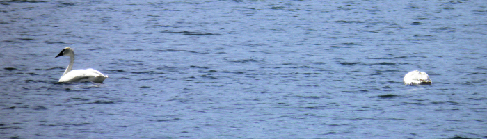 The first wildlife we see today is a first for the Great MisAdventurers, a pair of Trumpeter Swans. This swan is a rare bird throughout much of North America. Once common, it was heavily hunted in the nineteenth century. They were slaughtered in great numbers for their plumage, used to decorate ladies’ hats. By the 1830s, fewer than 100 birds remained. Today, it still does well in pockets of habitat scattered around the continent. One of these pockets happens to be the Yellowstone National Park region. Trumpeter swans are the largest waterfowl in North America, and easily the biggest flyers in Yellowstone. The wingspan of males (cobs) can reach seven feet. Cobs weigh between 25 and 30 pounds, while females (pens) weigh 23 to 27 pounds. The trumpeter is generally bigger and heavier than the eagle. |