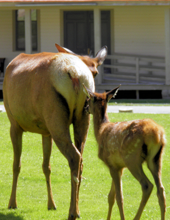 Our first stop today is at Sheepeater Cliffs, named for the Sheepeater Indians, a primitive band of the Shoshone tribe that had the distinction of being the only Indians to reside year-round in what is now Yellowstone Park. We see very similar lava formations that we visited along the Columbia River in Oregon on our Fall 2009 MisAdventure. Having never adopted the horse, the Tukudeka, or Sheepeater, lived in the mountains where they hunted bighorn sheep, elk, and deer. They were renowned for their prized bows, which they fashioned from the ram's horn of the mountain sheep. Arriving at Mammoth Hot Springs, we are greeted by elk with their young calves. These elk seem to have found it very confortable to live among the tourists, eating the NPS grass. |