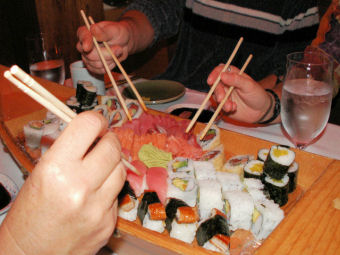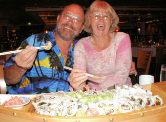 Our last dinner onboard is once again at the Ginza Sushi Restaurant. Sushi has three components; fish, vegetables, and cooked rice. Nigiri, or hand-made sushi, is the most common and is served in pairs. Maki, or sushi rolls, are made with sheets of seaweed and served as six slices. Oshi, or pressed sushi, is cut into small squares. And finally, Inarizushi is a stuffed bean curd roll.