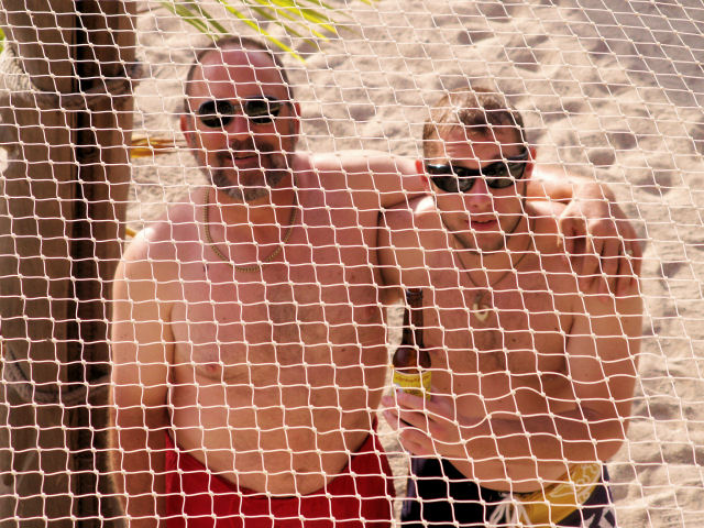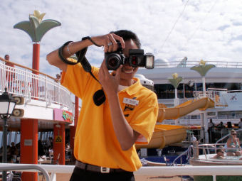 One thing we try to do is avoid the ship's paparazzi. They are there when you board, they are there when you dimembark, they are there at dinner. THEY ARE EVERYWHERE! David and Marcus were just lounging on the pool deck when this enterprising fellow showed up. He waited and waited until David put the camera down, then snapped a picture. These photos go on display in the hallways on the ship, the cruise line hopes you will buy them. Overpriced photos are not our idea of a good time, our trusty Konica Minolta DiMage Z6 digital takes fine pictures.