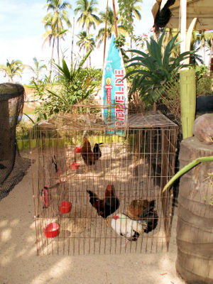 We found these critters in our beach restaurant. We think that the chickens are used as the sand cleaning crew, cleaning up the place after hours. The birds and the iguana (pictures below) were there for the benifit of the tourists, although we are sure that they could be on the dinner plate if requested!