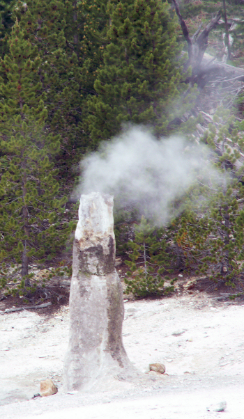 Today we hike south of Gibbon Meadows to Monument Geyser Basin, one of the strangest spots in the park. The small, nearly dormant basin lies at the top of a very steep one-mile trail. Thermos-bottle shaped geyser cones are remnants of a much more active time. The “monuments” are made of siliceous sinter and appear very similar to the siliceous spires found on the floor of Yellowstone Lake. Scientists think that this basin’s structures formed from a hydrothermal system in a glacially dammed lake during the last stages of the Pinedale Glaciation. This trail meanders along a gentle gradient following the Gibbon River then it turns sharply uphill and climbs 500 feet in 1/2 mile to the top of the mountain! Footing is on eroding geyserite and rhyolite, somewhat reminiscent of ball bearings. The geyser basin is a very interesting collection of geyser cones of varying sizes. |
